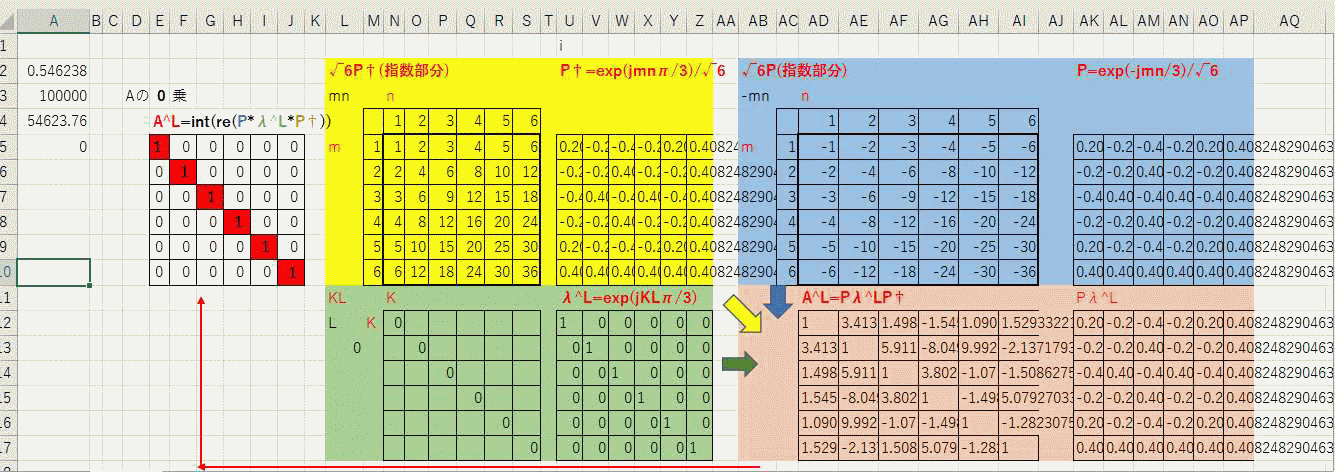 × [PR]上記の広告は3ヶ月以上新規記事投稿のないブログに表示されています。新しい記事を書く事で広告が消えます。 行列のべき乗 固有ベクトル 固有値 対角化 複素行列 非負行列 ペロン・フロベニウスの定理 グラフ理論 有向 重みなし 隣接行列 それが大事 ノルム 規格化 エルミート共役 ユニタリ行列 複素共役 転置 これの この行列の、固有値と固有ベクトルを計算してみましょう。 scilabでも求まるんですが、勝手に固有値の順番を 指定されてしまうので 手計算でやってみました。 そんな計算を海外旅行のホテルや機内でも淡々と行う、相変わらずのきのこですこんにちは det(A-λE)=0 (Eは単位行列) から、固有値λを求めてみます。 このように、 1行目-(2行目×λのべき乗) の繰り返しで、どんどん行列の次数が小さくなってくれますので 最終的には λ^6=1 という式になって という、1の原始複素6乗根のべき乗で、すべての固有値を表すことができます。 では、固有ベクトルはどうなるかといいますと nを0から5までいっぺんに計算させますと、以下のような関係を導出することができます。 また、6乗したら1に戻る性質を利用して、見やすくした上 すべての固有値の絶対値が1であることを利用して、√6で割り算することで、規格化も可能です。 ということは、対角化のためのブラ・ケットの片方はこのようになります。 規格化しているのでこのPはユニタリ行列です。 expを何度も描くのが煩わしいので、肩の部分だけ取って、便宜的に下部分のように表現することにします。 Pがブラだとすると、ケットはブラのエルミート共役 つまり 複素共役を取って転置したものなので、以下のようになります。 6乗して元に戻るので、冗長な書き方かもしれませんが、 規則性を表すためにあえてこのように書いています。 複素共役を取ったものが対称行列なので、その転置は同じものとなり エルミート共役は以下で表されます。 ケットがこのようにシンプルに表せたので、ついでにブラのほうもシンプルに表してみましょう。 このようになりました。 まあつまり、expの指数部分においての複素共役は、マイナスを取るだけでいいのです。 まとめると、対角化のためのブラとケットと、対角化された行列は、このように表されます。 具体例は以下のようになりますが 実は、1の複素6乗根はいずれも、1の複素原始3乗根 ω={-1+j√(3)}/2 とそのべき乗、あるいは複素共役か符号を反転したものだけで構成できることがわかります。 また、対角化された行列のべき乗は、以下のように簡潔に表すことができます。 これらを使って、元の行列Aのべき乗を表してみましょう。 A^L=P×(λ^L)×P† なので その過程をExcelにぶち込んで表現してみたのがこちらです。 原寸大はこっち ソースファイルはこっちからー! 黄色部分(左上)が対角化のための行列ブラP、青部分(右上)が逆行列=エルミート共役のケットP†、 緑部分(左下)が対角化された行列λのべき乗 それらの複素行列を掛け算したのが赤(右下)の部分で、一番左には計算して得られた行列Aの実整数を出力させてます。 行列の中身が複素数になるため、Excelの行列ライブラリは使えません。 そこで、複合参照と複素数ライブラリを用いて計算してます。 空白セルを指定して、そこでdel押しまくるなり再計算しまくるなりすると、動くと思います。 少なくともPCでは動きますが、タブレットではどうなるかわかりませふんせふん PR