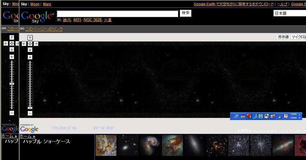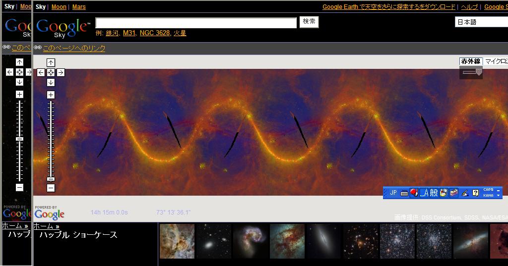 google skyだってさ。 といっても地球から見える天体の姿にはあまり興味がないので どっかで見たことがある。 それと同じことをgoogle skyでは空に向けてやっているらしい。 ふと、右上にある「赤外線」ボタンと「マイクロ波」ボタンが気になったので押した。 べ、別に宇宙に周期的な大規模構造があるわけじゃないんだからねっ でもこの波打ってるのは何だろう?