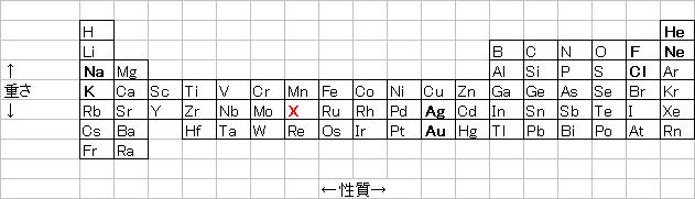化学者メンデレーエフは物質を構成する幾種類もの元素の性質について調べていた。 ナトリウム:ほかの物質と化合しやすい金属:A群 カリウム:ほかの物質と化合しやすいが、ナトリウムより重い金属:A群 銀:安定に存在する金属 金:安定に存在する金属だが、銀よりも重い フッ素:ほかの物質と化合しやすい:B群 塩素:ほかの物質と化合しやすいが、フッ素より重い:B群 ヘリウム:ほかの物質とほとんど反応しないガス ネオン:ほかの物質とほとんど反応しないガスだが、ヘリウムより重い A群とB群は特に反応しやすい などなど ということが以前からの研究でわかっていた。 メンデレーエフは、これを2つの要素の組み合わせで分類した つまり「性質」と「重さ」である。 すると、大雑把に以下の図のような分類ができる メンデレーエフは気づいた。 性質は陽または陰イオンになりやすさで決まるのではないか?と そしてそれらは基本的に18種類に分類できるのではないかと そうなのであれば、上の図のXに当たる領域にも、何かしらの性質を示す元素が入りうるのではないかと。 しかし、そのような元素は自然界には存在していなかった。 メンデレーエフは、Xという幻の元素の性質を「ちょうどマンガンと同じようなイオンになりやすく」、「マンガンよりも重い」と予想した。 その理論は当時、受け入れられることはなかったが、 彼の没後31年後ついに、実験的に生み出されることとなった。 その性質は彼の予言したとおりであった。 (少しばかり独自のストーリーを加えているので、あんまり鵜呑みにしないように) どうせ鵜呑みにするならこっちがいいよ ↓気に ![]() にほんブログ村 ![]() にほんブログ村