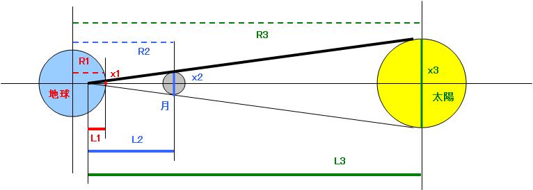 祖母の眼科に付き合ったときに眼科においてあるテレビで日食の特集をやっていた。 番組では、月が地球に落とす太陽光の影の移動を綺麗なCGを使って表現してくれた。 待ち時間の間退屈だったので、祖母とそれを眺めていたんだが、僕は祖母とぼんやり何かを話しながらも頭の中では別のことを考えていた。 遠近法で見ると、近くにある小さな月と、遠くにある大きな太陽が見かけ上同じくらいに見える。 だからこそ、太陽がギリギリ月にスッポリ隠れる日食という現象が起きるわけだが、地球から見た見かけの太陽と月の大きさがまったく一緒だったら、地球に落ちる月の影は大きなものにならずただ一点となり、皆既日食が起きる現場は非常に限られた地上の1ポイントになってしまうだろう。 皆既日食がある範囲で見れるためには、地上から見た月と太陽の見かけの大きさがまったく同じではなく、ごくわずかな大きさの違いがなければならない。 その大きさを計算してみたい。 家に帰ってから計算の試行錯誤が始まった。 ここに模式図を示す。 実際のスケールとは全然違うものなのだが、なにせ天文学的な物体なのでご了承いただきたい。 太陽と地球の間に月がある。 簡易的なモデルとして、太陽と月と地球の中心が同一線上に来たと仮定する。 地球の半径R1を太い赤の破線で、地球の中心から月の中心までの距離R2を太い青の破線で、地球の中心から太陽の中心までの距離R3を太い緑の破線で示した。 また皆既日食が見える範囲の直径x1を太い赤の縦線で、月の直径x2を太い青の縦線で、太陽の直径x3を太い緑の縦線で示し、 月の影の大きさが0になるポイント(以降「焦点」と呼ぶ)から地球表面までの距離L1を太い赤の横線、焦点から月の中心までの距離L2を太い青の横線、焦点から太陽の中心までの距離L3を太い緑の横線で示した。 三角形の相似から、それぞれの色の縦と横の実線長さの比は一致している。 x1/L1=x2/L2=x3/L3 L系の長さは基本的に未知で、R系の長さは既知であるので、L系とR系の関係は L1-R1=L2-R2=L3-R3 の関係が図から読み取れる。 これらの関係式から、求めたいものはx1の値である。 未知の変数はx1とL1、L2、L3の4つ、既知の変数はx2、x3、R1、R2、R3の5つに対し、イコールは4つ、未知の変数の数と式の数があっているので連立方程式としては解けそうである。 これをがちゃがちゃして解いていくと x1=(x3(R2-R1)+x2(R1-R3))/(R2-R3) 近似すると x1=x2-(R2-R1)x3/R3 となる。 このx1の式に既知の変数 月の直径:x2=3474.8km 太陽の直径:x3=1391000km 地球の半径:R1=6378.1km 地球-月間距離:R2=384400km 地球-太陽間距離:R3=149597870km を代入すると、影の大きさx1=-40kmと出てしまう。 影の大きさはマイナスになりえるのか? マイナスの影の大きさとはどんな意味か? ここで下の2つの図を見てほしい。 僕は当初、焦点が地球の内部に位置するとして計算していた。 だから影の大きさはプラスである。 しかし、太陽がより近く、焦点が地球と月の間に来た状態でも影はでき、日食は起こりうる。 影の大きさがマイナスというのはこういうことを意味していたのだ。 実は、このような状態で見れる日食は金環日食というらしい。 僕は皆既日食の影の大きさを計算しようとして、図らずも金環日食の影の大きさを計算することになってしまったらしい。 これでは皆既日食の影の大きさを計算できない。 何がいけなかったのか。 地球が楕円軌道であることを考慮していなかったのだ。 太陽と地球との距離を平均値で与えてしまっていた。 これを天文単位と呼んでいるらしいのだが、 地球が太陽からもっとも遠くなる距離は1.017天文単位 もっとも近くなる距離は0.983天文単位 実にたったの1.7%しか違わないのである。 それを考慮して再計算してみると 太陽から近いときは101kmの影の金環日食 太陽から遠いときはわずか19kmの影の皆既日食として算出できることがわかった。 (実際は皆既日食も金環日食も見れる範囲はもう少し大きいらしいく、それぞれ260kmと390kmくらいらしい。地軸の傾きを考慮に入れるとそのくらいになるのだろうか) 太陽と月の見かけの大きさがほぼ同じなのはすごい偶然だと認識していたが、 見かけの大きさが太陽のほうが大きくなったり小さくなったりするほど絶妙な関係だったとは思いもしなかった。 あと少し地球が太陽より遠ければ金環日食しか見れなかったわけだし 逆であれば皆既日食しか見れなかったわけである。 月の大きさ、太陽の大きさが少しでも違っていてもそうなるだけでなく、日食が見れること自体が奇跡的な偶然であることも考慮に入れなければならない。 月がこのような大きさと距離であったことは定説では「巨大天体の衝突」による偶然的なものであり、それでいて潮の未知引きや地球の地軸の安定化など、生命にはとても大事な要因であった。 また太陽がこのような大きさと距離であったことも定説では太陽系誕生時のガスの量しだいで非常に偶然的なものであり、それでいて水という「液体が固体より重