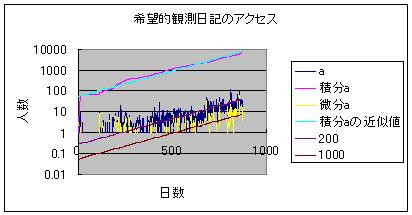 × [PR]上記の広告は3ヶ月以上新規記事投稿のないブログに表示されています。新しい記事を書く事で広告が消えます。 グラフにしてみた。 凡例の「a」は、当日のアクセス数 (「近似値」はその近似直線) 「aの微分」は当日と前日のアクセス数の差 (「200」はその近似直線) 「aの積分」はこれまでの「のべ」アクセス数 (「1000」はその近似直線) で、縦軸の人数は対数目盛にしてある。 見てわかるとおり、ものの見事に指数関数的に増えている。 aを積分しても微分しても、片対数グラフに直線近似できるということは 紛れもなく指数関数である証だ? (「のべ」の近似が54exp(日数/200)に近く、日数の係数である1/200をかけるとちゃんと「当日のアクセス」に近くなることからも、指数関数的であるといえそうだ。) しかもその傾きは3つともほぼ一致している。 どの時点で頭打ちになるのかはわからないが、 こうやってブログはしたたかに成長していくのかもしれない。 ※ライターの成長云々はおいとくとしてもだ。 (ただし、当日アクセスを微分したグラフは当日グラフの200分の1ではなく5分の1のように見える これは「当日」の微分までしてしまうと負の値が出てきてしまい、負の値が対数グラフに反映されないために起きていることなのかもしれない。) 昔、どこかのサイトで 「諦めずに更新を続けていると、アクセス数はいつの間にか増えている」 という文を見かけたことがあったが、こういうことだったのかもしれない。 これまでの800日間毎日、アクセスログを見ながら どんなワードでアクセスしてくるのかを確認してきたんだけど はっきりリピーターといえるアクセスはほとんどない。 しかしながら、どういうわけか 何らかのマイナーなキーワードでアクセスする人がいたり マイナーなキーワードで複数回アクセスがあったり 検索10ページ目にして漂着する人がいたり 初めてのアクセスなのにリンク元が不明だったり 結構よくわからないアクセスもちらほら出てきている。 少しは注目されだしているのだろうか。 あるいは、寝カフェ事情なんかを考慮すると 同一人物からのアクセスが、必ずしも同一PCからのアクセスではないことが 当たり前になってきているのかもしれない? や、僕自身はネカフェ使ったことないからよくわからないんだけども 人から聞いた話で。 ちょっと気になって今日、URLでぐぐってみたところ どこかの掲示板に画像だけ晒されていたらしいw そういうのは全然構わないと、ブログのトップに書いてあるので こっちとしてもそっちとしても気楽なもんなんだろう。 マイナーネタなら任せろって感じがしないでもない。 そして、サイトアクセス追い越しおめでとう! 2年間更新して、3年間放置したサイトのアクセス数に 開設から2年のブログのアクセス数がついに追い越しました! まあなんというか、非常にゆっくりしてるんですけどね・・・。グラフ見てもわかるとおりっす。 まだ7000人のあたりですよ>< ただ、このアクセスログは、管理人のアクセスの勘定を除いたものなので、カウンターをつけていた場合 もっと多くのアクセス数に見えると思います。 相変わらず閑散としてますけどね、いつもありがとうございますよ!!!!1 ちなみに、2010年10月15日までの18日間のアクセス状況の成分解析をしたところ このようになりました。 このブログの半分は「ラマチャンドラン・フィッシャーの予想」で成り立っています。 ![]() にほんブログ村 PR ![]() ![]() |