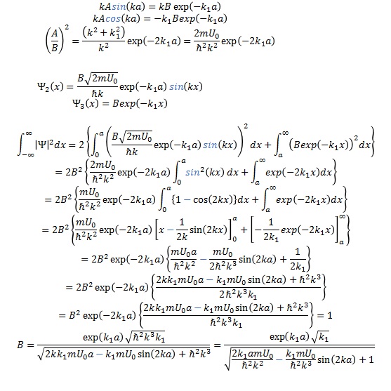 時間発展のないシュレディンガー方程式を解きます。 一般解はこうなりますが、境界条件 x=0とx=aでΨ=0を与えると、波動関数はΨ(x)=Asin(kx)となり なおかつ、nを1以上の整数として、ka=nπでなければならないことになるので こうなります。また、規格化条件も考慮すると、ブラ・ケットを用いて以下のようになります。 A=√(2/a)なので、波動関数は以下のように定まりました。 Aという物理量の演算子 Aの演算子をブラとケットで囲めばよいので 例えば位置xの期待値を知りたい場合は以下のように記述し、計算できます。 ちゃんと、どの量子数nでも「aの半分」と算出できましたね。 次に、xの2乗の期待値も調べてみましょう。 このようになります。 位置xの演算子はxそのものでしたが、 運動量pの演算子は異なってきて のようなベクトル微分演算子、特に一次元では ベクトル関係ない微分演算子になるので 特に井戸型ポテンシャルにおける運動量の期待値は 次に、またpの2乗の期待値について考えてみましょう。 こちらの値はちゃんと有限です。 特に井戸型ポテンシャルの場合は2階微分しているため、同じ関数同士の積の積分になって、値を持ちます。 それでは、先の<x^2>と<x>^2との間にはどのような関係があるのでしょうか。 一般の物理量Aには、平均値<>について 誤差の理論なのかRMS(実効値)なのかよくわかりませんが(サンプル数が多すぎて?)、とにかくこういう関係があるそうです。 後日勉強したいと思います。 そうすると、位置についてのΔxは、以下のように算出されました。 座標軸の中央をあえて井戸の中心から外しているのは、(Δx)^2=<A^2>ではないことを意識させるためです。 もう一つの理由は、量子数の偶奇によって、sinとcosが交互にこないように、sinだけで一括表現するためでもありました。 それでは、運動量についてのΔpも見てみますと 運動量の1乗の平均値がゼロなので、こうなります。 両者を掛け算すると こうなります。 量子数nが、1以上の整数の場合、ルートの中身は常に1以上です。 これの意味するところが、(ハイゼンベルクの)不確定性原理です。 具体的に井戸型ポテンシャルでやってみました。 やーそれにしても、こんないい例題をずっと見逃していたなんて。 井戸型ポテンシャルの、波動関数のだいたいの広がりが「(簡単に)計算できる」っていう発想がそもそもなぜかなかったんですよ。まったく貧相な想像力ですねえ。 無限深さだから、積分範囲も有限で、例題にはうってつけです。