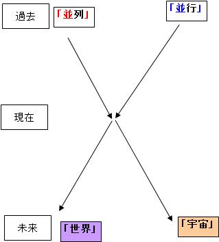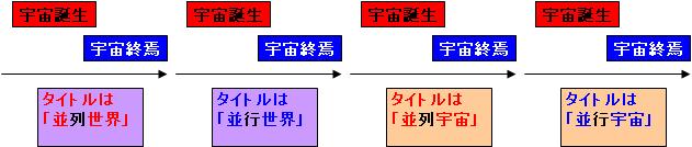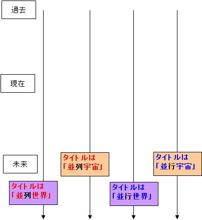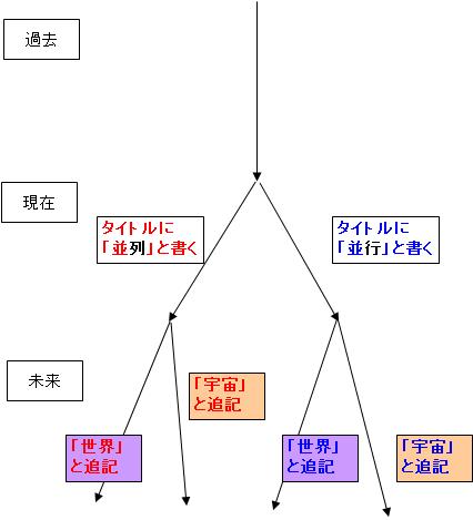 それを友達から借りてやったのがつい5年前くらいだった気がする AVゲームは、選択肢しだいでいろんなシナリオに分岐するんだけど YU-NOはその分岐をそっくりそのまま異世界の分岐として表現していた。 そこで、ふと気になったことがあった。 僕はどんなゲームをするときも、攻略する前に攻略本を読まないとクリアできない人なんだけど その攻略サイトに、こんな図があったんだ。 この「合流」って言葉に疑問を持った。 世界が分岐するとしたら、合流もするのか?それともしないのか? たとえば、こんな感じで4つの可能性に分岐する世界を こんなふうに 「元から似たような世界が4つあったんだ」と解釈することは可能だ。 しかし、根っこの部分の情報が重複してしまうのは、正しい世界観のあり方に反する気がする。 また、分岐先の未来にそれぞれ同様の現象があったとしたらその重複もおかしいと思うし 未来に向かってだけ分岐するというのも過去に対して公平な感じがしないし、分岐しない理由も特にない なら、過去に向かって分岐してもいいはずだ。 「過去への分岐」すなわち、「未来への合流」を意味する。 しかしそうすると、世の中の住人の持つ記憶は統一されているのだろうか? 別に、人によって同一の過去世界を持っていなくてもいいのではないか これは記憶が違うという意味合いではなく、 たとえば「1995年にB社の飛行機がS国に落ちた」とかいう一般的な認識すらズレていてもなんら不思議はないのではないかという意味である。 そして、過去は現在に、現在は未来に「分岐しながら合流もしていく」 それはもうごちゃ混ぜに。 「分岐」だけでも「元々分かれていた」とするより分岐したほうが、多数ある宇宙の情報がコンパクトになるのに 「合流」の要素が加わると、さらに「最初から最後までいくつあった」とする宇宙の数はもっとずっと、組み合わせ論的に膨大になる。 それならもっとコンパクトに情報を格納したいと、宇宙を設計する人がいたらそう思うのではないだろうか。 どうやら、現代物理学の基盤の1つの 量子力学の「多世界解釈」という解釈方法も元々、 分岐だけでなく合流も加味した世界観に近いらしい では、現代ではどうして認識のズレが起こらないのか? 実は微妙にズレていることに気づいていないだけかもしれない また「共通認識」が増えるごとに、過去も統一されていくのかもしれない かつては記録が曖昧だった。 だから過去そのものも曖昧だったのかもしれない 現在は記録が整っているために、 過去そのものも統一認識が主流だが 今後、思い通りの過去を共有する技術が生まれるかもしれない そうすると、過去の事実はコミュニティごとに曖昧に統一されるのではないだろうか ただそうすると、世界観や物理法則もある程度あいまいであるべきとなるので 案外、同じ世界観でこういう解釈もあいまいにアリなべきかもしれない 時間(時空)を有限にできるのならね。 ======= シュタゲの勢いがあればこその図入りで書けた日記なのかもしれない ありがとう そして、ありがとう!\(宣伝)/タイバニの。 並列宇宙 並列世界 並行世界 並行宇宙 平行 シュタインズゲート tiger bunny もし魔法が有限だったらエドラス にほんブログ村