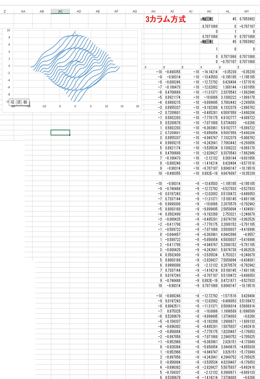 日本語でおk ってことで可視化してみました。 0~1の擬似乱数を3行3列の行列にぶち込んでます。(赤いほど大きく、緑いほど小さいように色分けしてます) この「中身が必ず正の実数」な非負行列Aに対して、複素数の固有値候補λを用いて行列式 det(A-λE)=0 の固有値方程式をλに対して解きたいわけですが、n行n列だと一般にn次方程式になりますよね。 そこで、det(A-λE)の絶対値をプロットして、そのゼロ点を探ってみることにし 条件付き書式と、マトリックス方式を使った3D描画でabs(det(A-λE))のゼロ点を探ることにしました。 λ=x+iyとして、基本的に横xを実軸、縦iyを虚軸としてます。 乳首色をしてる辺りがゼロ点です。 そのままだとあまりいいかんじに炙りだされないので、abs(det(A-λE))を指数関数に入れたEXP(||A-λE||)で誇張表現してます。 (3行3列のAにしたのはサラスの方法でサボりたかったからです) 見事に、右寄り横長になりましたね。これがペロンフロベニウスの定理の言いたいことの1つのようです。 今回は3次方程式なので、複素解も含めると一般に3つあるわけですが 非負行列の固有値は「絶対値の一番大きな解が必ず正の実数」ということですね。 これは便利。 なんでかといいますと フィボナッチ数列を行列とみなしたときの日記を見てもらうとわかるかと思うのですが フィボナッチ数列って黄金比を比率とした等比数列に漸近していくんですよ。 それと同様に、同じ非負行列Aを何度も何度も掛け算し続けると 正の実数の効果だけが生きのこって繁栄されるというわけです。 (ところで、 残りの固有値は必ず「実数」あるいは「複素共役」になるのかな??固有積である行列式も非負実数だろうし:4次以上じゃないとなんともいえないかも) それはそうと、ちょっとずつ違った非負行列Aが100個くらいあって A1~A100まで全部掛け算したらどう近似されるんだろう? ってのは、結構みなさん気になりますよねたぶん。 気が向いたら調べてみます。 よかったらExcelDLファイルでも遊んでやってください^^ expに打ち込んだらゼロ点はイチ点になりますよね・・・ ![]() にほんブログ村 ※追記 実対称非負行列の固有値wwwwコンボ縛りすぎわろたww PR