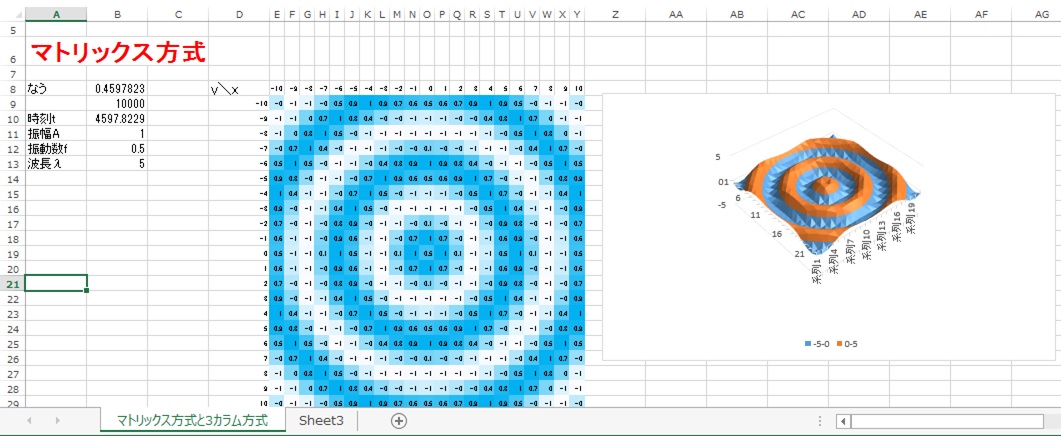 そこで知ったんですが、 Asin(2π(√(x^2+y^2)/λ-ft)) こういう描画方法をマトリックス方式 こういう描画方法を3カラム方式 と、呼ぶらしいです。 名前があると便利ですね! ただ・・・あまり浸透した名称ではないような気もします。 なお、マトリックス方式のデータをコピペーではなくカッペーしてそのまま3カラム方式に流用している関係で、ラインかメッシュ、どちらか片方をサボっています。 いつものごとく、delボタン連打りんぐか押しっぱなしで再計算するので、動きます。 それと、DLエクセルファイル ![]() にほんブログ村 ワイヤレスイヤホン左耳です。(レッドエレファント・ー+・ 付属の右耳です。 マイクロUSB仕様なので、イヤホンジャックとの変換ケーブルを買いました。 僻地だからなのか変換ケーブルは100均にはありませんでした。 元々はこれを車載のオーディオ機器につなごうとしてた(意図おかし)のですが ためしに100均の有線イヤホンにつなげてみました。 マイクロUSBからは右耳用の音しか出てないため、 有線イヤホンからも右耳用からしか音が出ません。 意外と紛らわしいので、「ON」と書いたラベルを貼ったのですが すぐに剥がれてしまいました。 「NO」と縦読みできそうなところが余計ややこしいという懸念もありましたがこれは逆さ読みでありまして、正確に縦読みするなら「小津」です スタッカートみたいにムネを叩く四畳半並感 劇場版けいおんのOPに似てるという発想はなかった 有線イヤホンをつけてみて思ったのですが 電池の減りが異様に早いです。 すぐに中国語で「充電不足」と言ってきます。 このワイヤレス、原産地中国なんですよ。 過去にも「充電不足」には遭遇したことがあったのですが あまりにも早かったので、さすがに不安になって「これホントに『充電不足』って言ってるんだよね?」 と、googleのエキサイト先生にご発音願いました。 他の国だったらちょっと検索しづらかったでしょうね 充電不足を確認したところで、 ふと疑問がよぎりました。 フル充電して聴き始めてからしばらく経つと、音が途切れやすくなるのです 何が原因だろう?と思っていまして ・車の「導体に」干渉される ・車の「通信機能に」干渉される ・風に電波が流される ・気温の低下による電池消耗の割増 など幾つか候補は上がっていたのですが 先日の日記に書いた「風に電波が流される」はどうも勘違いだったような気がしてきました。 風が吹かなくても車に近づいただけで音がかなり途切れるんですよ 途切れ方が激しいと、雪崩のように連鎖的に途切れる癖があるかもしれません それから、このワイヤレスシステムは、受信側だけの問題ではなく、送信側のガラケーにも問題がある可能性が浮上してきまして ・ガラケーだから なのか、あるいは ・ガラケーの充電の低下 によるのか、中国語で「充電不足」と聞こえる結構前から途切れるっぽいのです。 とにかく、このワイヤレスイヤホンの性能だけで決まる話ではなさそうな気がしてきたのです。 さらに 「充電不足」が叫ばれる中、有線イヤホンをワイヤレスイヤホンから取り外し、片耳だけで聞くと、「充電不足」が解消し、2倍ほど長持ちしそうな感触も出てきまして こちらの問題に関しては もしかしたら インピーダンスマッチングをサボっている可能性があるのではないかという疑惑が浮上しました。 元々、付属の右耳用イヤホンから出る音が弱かったのです。 もしかして、専用の付属イヤホンにはインピーダンスを細工しているのでは? とも思いましたが仮説止まりです。 ともあれ、「付属の専用イヤホン」と「変換ケーブル→100均イヤホン」とでは2倍以上電池の持ちが違うようです。 とりあえず、片耳だけでも充電不足が否めない場合のために、本来の有線ケーブルの使い方もできるように、変換アダプタをストラップにして合体させておくことにしました。 ↓ ↓ まあ、いわゆるバルキリータイプの3段変型が可能です。 ![]() にほんブログ村