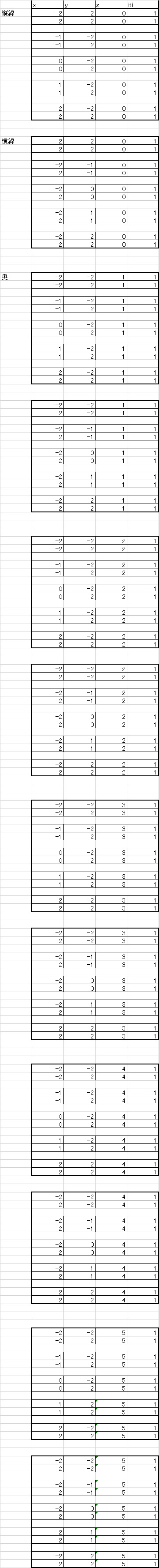 まず、x,y,zと、itiという項目ラベルを設けます。 itiという項目には必ず「1」という数値のみが入ります。 長さが「-2」から「2」までの縦線を描きます。 この縦線を、横間隔「1」で「-2」から「2」まで5本コピーします。 このとき、線と線の間に1行以上空白を空けましょう。 次に、縦(y)と横(x)を入れ替えてコピーし、縦線を横線化して5本描きます。 このときも1行以上空けるのですが、縦と横が入れ替わった目印として、2行空白を空けたり、左の列にメモや注釈(宣言)を添えるとよいでしょう。 最後に、これらの縦横5本ずつの格子を、奥行方向にさらに5本コピーします。 奥行き(z)の数値は「0」から「5」まで、「1」間隔とします。 このときも左の列に宣言文を設けたり、目印として3行空けるとよいでしょう。 これで、3D格子データが揃いました。 ======= 移動と伸縮の行列を用意します。 この行列を、4列1セットの行ベクトルの右に掛け算して、結果をさらにその右に4列1セットの行ベクトルとして出力することで、移動と伸縮を可能にします。 この行列のB、C、D(色つき)がそれぞれx、y、z方向の伸縮度合い、x0、y0、z0(色)がそれぞれx、y、zの移動度合いを表します。 つまりこういうことです。 行列を掛け算する前のx,y,zをそれぞれ、x1,y1,z1、掛け算したあとのx,y,zをそれぞれx2,y2,z2とすると x2=Bx1+x0 y2=Cy1+y0 z2=Dz1+z0 となるわけです。 また itiの項目はどうあがいても「1」にしかならないことがわかるかと思います。 ======= この移動と伸縮を行った結果のベクトルを遠近法によって3Dに可視化します。 比例係数をAとして 横=Ax/z 縦=Ay/z です。これを2Dグラフに折れ線描画(点なし)すると、なんとなく3D描画のように見えるはずです。 ======= ただし、このままでは負の奥行き(カメラのこっち側)に対応できていないため、例外処理をほどこします。 参照するzがゼロ未満だったら縦=横=0 とする例外処理です。 if(z>0,Ax/z,0) if(z>0,Ay/z,0) こうなります。点描画ではなく線描画なので、ど真ん中に隠します。 また、今回は特例というか一時的な措置として、奥行きに伸びる線がないからできることです。 ======== z0の値を変化させると、カメラが奥行方向に移動するのがわかるかと思います。 ======== delボタンでもおして再計算するたびに自動で動かせるようにもしておきましょう。いつもの now()-today()に速さ100万くらいを掛け算することで 割りとぬるぬる動かすことが出来ます。 また、Fで割ったあまりmod(1000000*(now()-today()),F)をz0で参照しますと、F周期の動きになります。 ======= 一方、比例係数Aを変化させるのはただのズームに相当するわけですが カメラの位置の変更とただのズームとでは微妙に映る景色が異なるのがおかわりいただけたでしょうか。(間違い探し感) たとえるなら ビルの向こうに月が写っていて、ビルの向こう側から撮影するか、ビルの手前から望遠で撮影するかの違いのようなものです。 大きく月を写真に撮るテク、超望遠なんかは、普通の人より思いっきり後ずさってその分めっちゃ望遠して撮影してるんだと思うわけですが(そのため広大な風景がになりがちですよね) ところで ![]() 被写体の大きさを固定したまま 望遠と移動を連動させるあの描写方法っていうんですか、演出? こういうのなんて名前なんでしょうか。 どうも僕は実写「いいひと。」で初めて認識したように思うのです ズームの比例係数Aを、A=(z0+6)/3としてます。 z0=if(-mod()<奥行き限界、奥行き限界、-mod) 奥行き限界=5(最後のコマで静止させるため) -mod=-mod(なう×速さ、周期) なう=now()-today() まあ、よかったら元データのExcelファイルのおもちゃでもDLして、遊んでやってください ![]() にほんブログ村