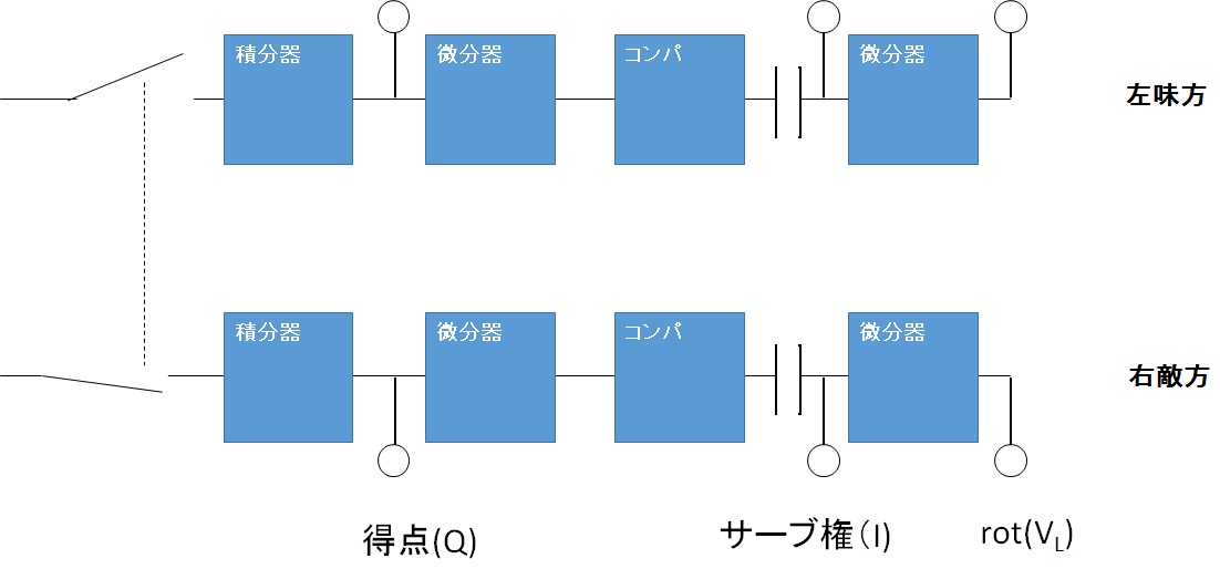 つまり味方に収益があればプラス、費用があればマイナス この残高を、取引ごとに微分する。 この符号をコンパレータで取得すると、サーブ権のあの「得点ボードの上にある1bitそろばん」になる そして、このそろばんの位置を取得したところで この「位置」を微分した「速度」も、取引による微分回路で取得する。 これがローテーション・フラグとなる。 バレーにも 適用できる 最上川(マックスウェル方程式) ![]() にほんブログ村 これを「排球盤」と呼ぼう。ブレッドボードでできる、ボードゲームだ。 取引回数を同期づける矩形波が必要だな。時間微分だと連続的すぎる