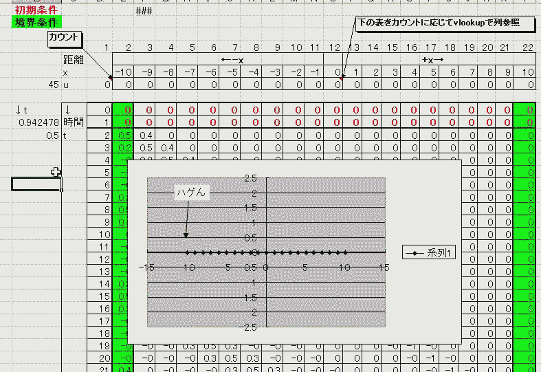 シュレディンガー波動方程式、 iħ∂u/∂t=[(-iħ∇)^2/(2m)+V]u じゃなくて純粋な波動方程式 ∂^2u/∂t^2=c^2∇^2u のほうのやつ、とりあえずようやく数値的に解けた! Excelで! といってもまだまだ一次元で こんな感じのやつです。 ホントはこいつ、循環参照でやりたいんですわ。 でもなんか不安で、何日もくすぶってるんですわ なんでこんなことでくすぶってんのって自分でも思うんですけど、なんか不安なんですよね。 上の表で下の表をvlookupで列参照してるんです(横が距離xで縦が時間tってことになってます)。 下の表自体はすぐに収束して静的なんすよ。この時点では循環参照まったく使ってません。 下の表の1行目と2行目が位置と速度の初期条件で、右端と左端がそれぞれ境界条件なんすわ 今回は左端が波源でsinを入れといて、右端で固定タン反射させてます。 「右端=0」の境界条件で固定タン反射、「右端=すぐ左」で自由タン反射なのはわかったんですが そのあいだの、たとえばインピーダンスマッチングを行なって反射しない場合の境界条件がまだよくわからないんですよね それと、時間に1次元配列使ってるのがもったいなくて・・・ 3行目以降の白セルの中身は同じ演算で2個上と1つ上、それと斜め右と斜め左しか参照してないんで ぶっちゃけ3行目と4行目をお互いに循環参照しあえば出来ちゃいそうな気もするんですよ そしたら縦のセルが空くんで、満を持して横:x、縦:yの2次元の波にしたいんですよねぇ いやーこれもZ状参照が許してくれるかどうかわかんないんですが。 課題が多いんですけどやるべきことはほぼわかってるし、地道にやればいいだけなんですけどね どうも調子が出ません。 出ないので説明も兼ねて中間報告なんすよ 「シュレディンガータイプばっかり目立っちまいやがって・・・! 俺のほうが本家だっつーのによ」 ![]() にほんブログ村