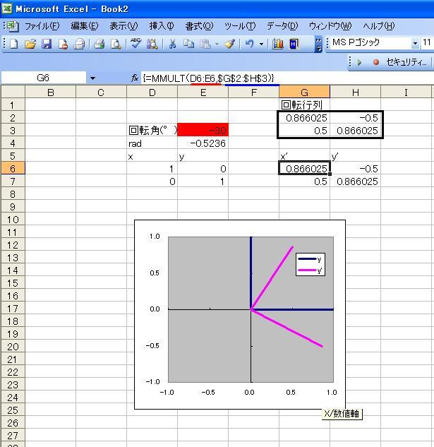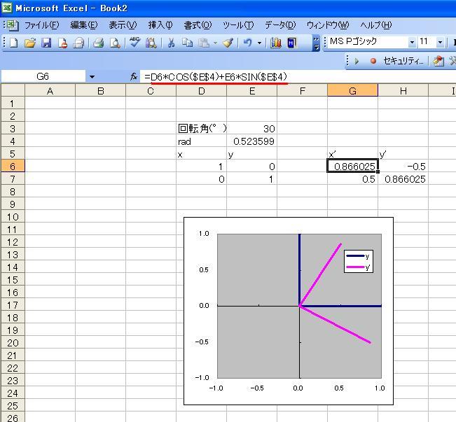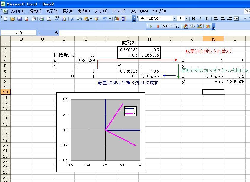 x-y平面から30度傾けたx'-y'平面を描写するのに なぜかわざわざ逐一 x'=x*cosθ+y*sinθ y'=-x*sinθ+y*cosθ とか入力してたりする。計算式でケアレスミスがでがち 回転行列かければいいのによー ======== パート2 回転行列利用するにしても、一旦転置なり行と列の入れ替えなりして列ベクトルに直してから回転行列を左から掛け、その結果の縦ベクトルを再度横ベクトルに戻すとかいう厄介なことを行っていたりする。 なかなか煩雑 ======== パート3 手間とスペースを省くために一連の計算をいっぺんに行う。 が、多数のベクトルを扱うと無駄な2回の転置のため処理に時間がかかる。 扱うベクトル(というか点)がたくさんあるほど処理落ちする ======== パート4 回転行列を横ベクトルの左に掛けれないなら右に掛ければいいじゃない (ただし回転角は符号が逆になる) 処理もコピペで済むし計算に手間取らない しかし3次元ベクトルだとジンバルロック問題が残る クォータニオンはジンバルロックがないが、エクセルでやるには手続きがちょい面倒。 matrixアドインを入れたら固有値近辺以外では複素数の使い勝手が案外よく、行列形式でクォータニオンを扱えないか検討中。 パウリ行列との関係性が理解できればなぁ あくまでマクロは組まない主義。組まなければいけないマクロは手短に。 ![]() にほんブログ村 |