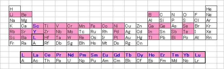 レアアースはレアメタルの一種ですって話になって じゃあレアメタルってなんですかってなったら 割りと法則性のない元素の名前があがって あれ?レアアースはアクチノイドを除いた第3族(左から3列目)って割りと硬派な定義があるのに レアメタルの定義ってずいぶん曖昧なんだな って思って、ちょっと表を作ってみました。 ピンク地がレアメタルで、その中の青字がレアアースです。 ちなみに周期表本体のLはランタノイド、Aはアクチノイドで、 それぞれ詳細は図の下部分の補助表参照になります。 なんだかレアメタルって、希ガス(右端)とハロゲン(右から2列目)を除くってこと以外に あんまり共通項ないですよね。 アルカリ金属(左端)、アルカリ土類金属(左から2列目)においても当てはまったりはまらなかったり (H水素、Naナトリウム、Mgマグネシウムは除いて、 Liリチウム、Beベリリウム、Rbルビジウム、Srストロンチウム、Csセシウム、Baバリウムは含むとか) 真性半導体元素は除くよってわけでもないですし (炭素Cは微妙ですが珪素Siは違うのにGeゲルマニウムは当てはまるとか) 真性半導体の不純物も除いていたり入っていたり (Bホウ素やGaガリウムは入ってるのにAlアルミは除くとか) おそらく、レアなメタル(金属)って程度の定義なんでしょう。 金(Au)・銀(Ag)・銅(Cu)とその右隣(亜鉛・カドミウム・水銀:Zn・Cd・Hg)がレアじゃないのはなんでしょうね 表の真ん中にいるから希ガス同様イオン化しにくく、単体で見つけやすいとかそんな理由でしょうか。 フランシウム(Fr)以降はまあ、重い元素でだいたいが放射性元素だからいらないよーって感じですか それにしてもH水素からCnコペルニシウムまでの112種類の元素中、 レアメタルが48種類って半数近いじゃないですか。 種類だけで見たら全然レアじゃないみたいに見えかねないですよね(笑) 中国のアレがきっかけで、脱レアアース工業とかって進みそうですけど 地球における埋蔵量はともかくとして やっぱりレアアースだからできることとか、レアアースだから容易だったことを レアアースなしでがんばってみようとかって、なんか効率悪くないですかね。 そんなん、バベられなかったらとでもいいますか(笑)国が1しかなかったら 起こらなかった問題かもしれませんし なんか無駄なことやってないかなーとか思ったりもしないでもないです。 新技術や新発見があるだろうってことを見越すと一概に無駄じゃないのかもしれませんが。 にほんブログ村
