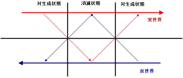 そしたらまあ当然のごとく、サジェストでCPT対称性っていうのは出てくるんだよな。 まあ気分転換にCPT対称性でもぐぐってみますかってことで「CPT対称性」まで打ったのはいいんだが、サジェストに「CPT対称性の破れ」ってのが現れるんよ。 いやいやいやCPTは破れないことが前提なんじゃねーのかよ とか微笑んでたんだけど、なんでサジェストに乗るだけの検索がなされてるんだろうと気にかかってな まあCP対称性の破れと勘違いしてぐぐってる人でも多いんじゃねーのってノリでぐぐって見たんだよ。かすかにいやーんな予感もしながら。 そしたら、最近の物理学ってCPT対称性の破れまで議論し始めてるんだってな。おいらびっくりしちゃった。 CPT対称性って元々はローレンツ対称性ってのからきてるらしくて まあローレンツ変換のことだよな このローレンツ対称性が破れてるってことは、部分的に相対論が破綻しているってことを意味するらしい・・・。 まあ、前々から量子論と相対論を統一する際には相対論のほうが譲る傾向はあったみたいだけどねえ・・・いよいよって感じ? Cは荷電共役変換対称性 Pはパリティ変換対称性(空間対称性) Tは時間対称性 で、現在のところCは個別で破れていて、Pも個別で破れていて、CPもわずかに破れているから、CPTが破れていないためにはTも破れていなければならないって感じだったらしいんだけど まさかCPTまでも破れているかもしれないとはねー・・・ CPが破れていてCPTが破れていない場合は 粒子と反粒子のどちらかの数が多くて、対消滅してもわずかに残るから、宇宙は粒子にあふれていて反粒子が天然に存在しない っていうのを導けるらしいのね で、反粒子ってのは過去に向かう粒子を未来に向かう反粒子に解釈しなおしたものっていう理解があって、 T対称性ってのはおそらく、宇宙を巻き戻しみたいに見ていくと普通に再生したのとは違って見えるっていうのを言いたいらしい。 とはいってもこれはミクロの話で、マクロで見た宇宙の巻き戻しが普通再生時と似ても似つかないのは承知のとおり、 でも、ミクロで見ると再生と巻き戻しは区別がつかないべきだとされてたらしいんだわ。かつてはね。 でも、それが違うってんなら この宇宙は粒子の世界と反粒子の世界が常にペアで存在するべきってことを言ってたりしないだろうかねえ。 この図みたいな感じでさぁ 右に向かう赤の矢印が粒子の世界 左に向かう青の矢印が反粒子の世界 で、赤の世界のレギュラー粒子は右を未来にして進んでいて 青の世界のレギュラー粒子は左を未来にして進んでいる が、ほっとんど同じポイントで両者の粒子は交差する。 そうすると、真ん中の「消滅状態」のところでは、赤も青も共にアウェイな世界にいるわけで、この状態では粒子も反粒子もお互いに見えないってことにならないかなーなんて。 両側の「対生成状態」では、青も赤もレギュラーでいられる世界にいるから、それぞれ粒子と反粒子として実在するんじゃないかなぁと。 (反世界からは赤のほうが反粒子と見なされる) で、横軸は時間軸だけど、縦軸は実は空間ではなくてエネルギーの軸のほうがより適切なんじゃないかなぁと。 真ん中の黒い線を境にして、赤はエネルギーの低い下の方では姿を隠し(という維持できず?)、青も低エネルギーの上のほうでは姿を隠している。 ただし! 赤と青の世界がビミョーーーーに非対称であるために、粒子と反粒子の住み分けが始まった。 という解釈はできないかなーって思ったりするんよね。 でもそうすると、なんとなーくだけど粒子と反粒子、または実世界と反世界のペアありきみたいな世界観っていうか枠組みが最初からあったみたいな感じがするんだよねえ あーそれはどの解釈でも同じなのか。 この解釈だとディラックの海解釈を否定しないまま現在の解釈もできそうな気が・・・しないかなぁ? ====== ところで、CPT対称性も破れているときに起こることといえば主に 粒子と反粒子の質量の格差らしいのね そういえば最近、ニュートリノ振動の結果から、ニュートリノと反ニュートリノの質量に差がありそうとかって話がなかったかなーって思ったのよ。 まあ素人考えとしては結び付けたくなっちゃうんだけど 数値の規模が違うからとか、結び付けるには強引過ぎるとかいう意味で、また違う未知の現象って考えてるのかな? 気づいてないってだけじゃないんだよね? にほんブログ村