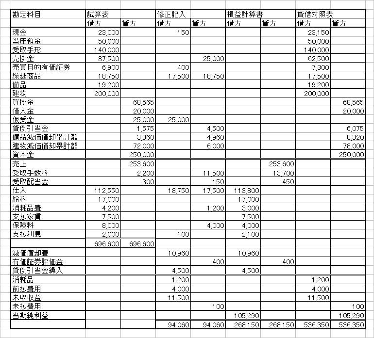 計算機科学「でも、それじゃまだ6列じゃんか。どうやって3列にすんだよ。試算表部分と修正記入部分はしょうがないんだったらそれ以上直しようがないじゃんか。」 XX「いや、まだあるんだ。俺は以前から、エクセルで計算するときの統一性のなさというか、そんなあたりにわずらわしさを感じていたんだけどね」 計算機科学「というと?」 XX「試算表と修正記入を合わせるとき、たとえば仕入勘定だったら借方に来るはずだから、借方にだけ式を入れ、貸倒引当金だったら貸方だけに式を入れるのって場当たり的で気持ち悪いじゃん。」 計算機科学「確かにエクセルでやるからには統一した式で一発ドカンと入れてしまいたくなるわな。」 XX「でもよ、そうするにはif関数とか使って条件わけしなきゃならなくて式が長くなってめんどうなんよ。」 計算機科学「そうか。それなら場当たり的に式を入れたくもなるわな。」 XX「そもよもよ?なんでさっきも言ったけど、なんで借方と貸方にわざわざ同じ数値を2度も入れるんだって話なわけよ。電子化した今、わざわざ紙で会計やる人も少ないわけだし、そこはかえってケアレスミスの元だと思うんだよな。」 腐会計子「でも、借方か貸方どっちかにしたらマイナスの数値が出てくるってわけだよね?」 XX「それのどこがまずいんだ?」 腐会計子「それもそうだね・・・」 XX「資産と費用の増加は+、負債と収益の増加を-って定義しておけば、別に2列取る必要は何もないんじゃないかって思ったわけよ。そうするとな、最終的な損益・貸借に入れるべき式も「=試算+修正」だけで統一的に処理できるんだよな。そうすると、最終的にこうなった。」
