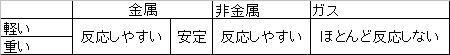 化学者メンデレーエフは物質を構成する幾種類もの元素の性質について調べていた。 ナトリウム:ほかの物質と化合しやすい金属:A群 カリウム:ほかの物質と化合しやすいが、ナトリウムより重い金属:A群 銀:安定に存在する金属 金:安定に存在する金属だが、銀よりも重い フッ素:ほかの物質と化合しやすい:B群 塩素:ほかの物質と化合しやすいが、フッ素より重い:B群 ヘリウム:ほかの物質とほとんど反応しないガス ネオン:ほかの物質とほとんど反応しないガスだが、ヘリウムより重い A群とB群は特に反応しやすい などなど ということが以前からの研究でわかっていた。 メンデレーエフは、これを2つの要素の組み合わせで分類した つまり「性質」と「重さ」である。 すると、大雑把に以下の図のような分類ができる メンデレーエフは気づいた。 性質は陽または陰イオンになりやすさで決まるのではないか?と そしてそれらは基本的に18種類に分類できるのではないかと そうなのであれば、上の図のXに当たる領域にも、何かしらの性質を示す元素が入りうるのではないかと。 しかし、そのような元素は自然界には存在していなかった。 メンデレーエフは、Xという幻の元素の性質を「ちょうどマンガンと同じようなイオンになりやすく」、「マンガンよりも重い」と予想した。 その理論は当時、受け入れられることはなかったが、 彼の没後31年後ついに、実験的に生み出されることとなった。 その性質は彼の予言したとおりであった。 (少しばかり独自のストーリーを加えているので、あんまり鵜呑みにしないように) どうせ鵜呑みにするならこっちがいいよ ↓気に にほんブログ村 にほんブログ村