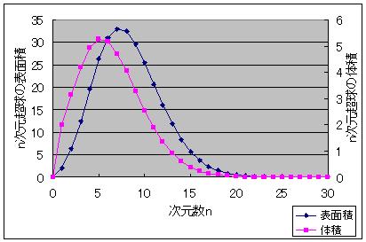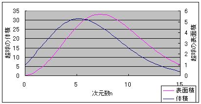 n次元超球の体積の求め方は、数値積分としてはさほど難しくないことがわかった。 断っておくが、n次元超球の「体積」がもはや「体積」ではないことは承知している。 以前はn積、n-1積などと呼んでいたが、やっぱり体積・表面積と呼んだほうがイメージしやすいようなので、以後こう呼ばせていただく。 まず2次元超球(円)の体積(面積)V2=π・r22を出しておき r2=√(r32-z22)とした上で V3=∫-r3r3V2dz2 を行うと、3次元超球(球)の体積V3が求まるので これをn次元に拡張すると rn-1=√(rn-zn-1)とした上で Vn=∫-rnrnVn-1dzn-1 ただし、すべてのrn=rであるとする。 とすれば、漸化式的にn次元までの超球の体積を計算できるというわけだ。 これを漸化式から一般式に直すのは簡単で、 単にn重積分を行えばよい。 これを解析的に計算する方法はめんどくさいので具体的には行わないが ∫Vn-1dzn-1を行う上でanをn番目の数列として Vn-1=an・r^n-1 であることと rn-1=√(rn-zn-1) であることがつながると ルートの入った積分と入らない積分を交互に繰り返して行くことが 奇数次元と偶数次元の体積の式ががらっと変わってしまっている原因を作っているのだろうということは確認できた。 これがその式なのだが 体積が rn(2*(2π)(n-1)/2)/n!! n:奇数 rn((2π)n/2)/n!! n:偶数 で、表面積が rn-1)(2(2π)(n-1)/2)/(n-2)!! n:奇数 rn-1((2π)n/2)/(n-2)!! n:偶数 となっている。 n!!は階乗の拡張で2重階乗といい、 nが奇数のとき→n(n-2)(n-4)・・・5・3・1 nが偶数のとき→n(n-2)(n-4)・・・4・2 といったものである。 これをグラフにしたものが以下の図である。 半径を1とした。 驚くべきは、体積・表面積ともに最大値のある次元が有限であるということだ。 体積は5次元、表面積は7次元で最大になる。 それともう1つ、 違う式なのにもかかわらず、グラフが滑らかである点が気になった。 ここで疑問が沸く。 これはもしかして、1つの式で表すことが可能なのではないか? そして、n次元を整数から実数に拡張できるのではないか? つづく。 ↓気になったらポチ。お願いしますね にほんブログ村 にほんブログ村 天才てれびくんOP「パリは恋の街」TT.Charlie 地球は回る 星は流れる |