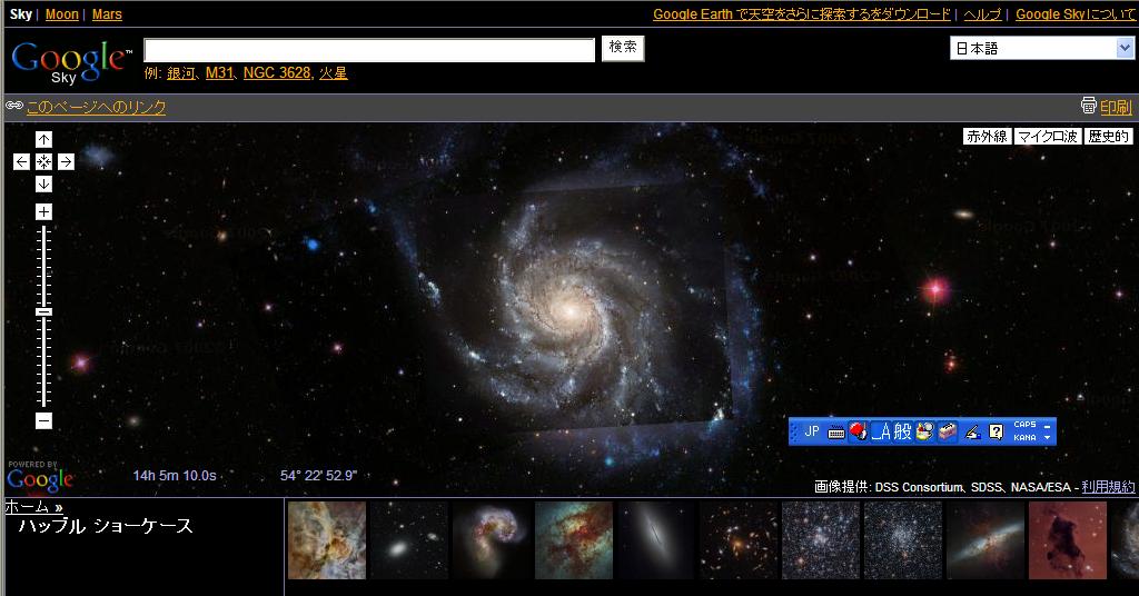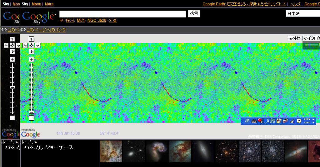 google skyだってさ。 といっても地球から見える天体の姿にはあまり興味がないので どっかで見たことがある。 それと同じことをgoogle skyでは空に向けてやっているらしい。 ふと、右上にある「赤外線」ボタンと「マイクロ波」ボタンが気になったので押した。 べ、別に宇宙に周期的な大規模構造があるわけじゃないんだからねっ でもこの波打ってるのは何だろう?