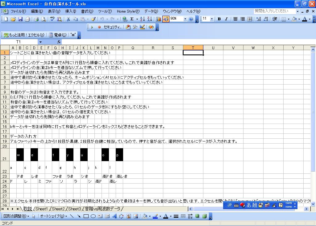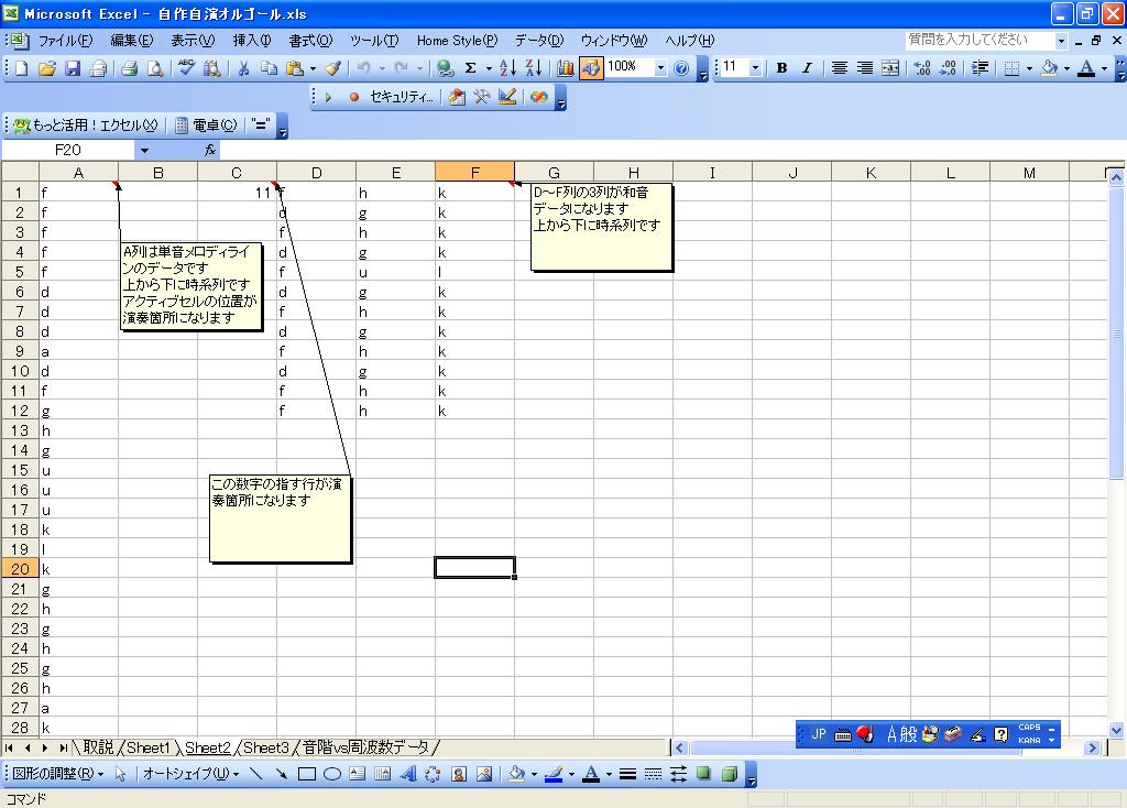 メロディラインのデータは単音でA列に1行目から順番に入れてください。これで楽譜が自作されます 和音のデータは3和音まで入力できます。 bキーとvキーをほぼ同時に打って和音とメロディーラインをミックスもどきさせることができます。 データの入れ方 ※エクセル本体を開くたびにマクロの実行が初期化されるようなので最初はキーを押しても音が出ないと思います、エクセルを開くたびに「susumu」と「susumu2」と「oto」の3つのマクロを実行すると次から音が出るようになると思います。