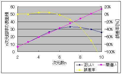 2009年1月7日の日記で、n次元空間における丸い物体(超球というらしい)の体積(n積?)や表面積(n-1積?)のようなものは