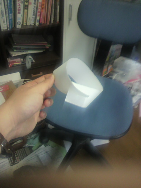 どれも物理で宇宙な言葉である。 スパノバは超新星爆発、星が一生を終えたときに起こす爆発のことだ。 スピノザはアインシュタインが慕っていた数学界の神様のような存在。 スピノルは、2周回転して元に戻る不思議な量のことを指す。 2周回って元に戻る・・・元に戻るということが1周するのと同義であるように思えるならば、なんだか矛盾した響きに聞こえなくもない。 そんな奇妙なものだが、別に身近にないわけでもない。 メビウスの輪なんかがそうだ。 表面を1周していると裏面につながり、裏面を1周していると表面につながって元に戻る。 それならば、4周して元に戻るメビウスの輪も作れそうではないか 従来のメビウスの輪は表と裏の2面を使っていた。 ならば、4周して元に戻るメビウスの輪は消しゴムのようなやわらかい素材で四角形を伸ばしたような長い棒を作って、それをねじってつなげればいい。 だがちょっと待ってほしい。 紙にだって4つの状態はあるではないか 表と、裏と、右端と、左端・・・ というわけでできたのがこれである じゃーん 4周して元に戻るメビウスの輪・・・ 作り方は簡単、紙をちぎって細くして、両端に切り込みを入れてねじってつなぐだけ。 ここに書くまでもない。見ればわかる。はさみものりもいらない。 本当に4周して元に戻るかどうかは実際に作って自分で指でなぞってもらったほうが早い。 にほんブログ村 これ、欲望のままにすべてを叶えたら破産するんじゃなかろうか・・・