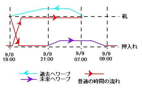 パソコンのビミョーな変化に気がついた デスクトップに見慣れない画像ファイルがある 開くと、何かのプログラムコードのようだ。 僕以外誰も触らないパソコンに誰がどうやって画像ファイルを仕込んだのか のんきな僕はあんまり気にしてはいなかった。 今日はなんだか押入れでコード組みたい気分だな 押入れのパソコンを机によけてっと。 午後9時 とりあえず目の前にあるコードを開発ソフトで打ち込み終えた 実行画面が現れた。そんなコードだったっけ? 時計のようだ。今9時だっけ。今日は9/9だよな。 なんか寝ぼけてるな。顔洗って寝よう。 2010年9月9日午前7時 あれ?僕のパソコンはどこだ? なんか押入れの中ホコリだらけだし 寝てる間に押入れから出しちゃったのかな。 やはりパソコンは机の上にあった。 でもおかしいな、画像ファイルもプログラムコードもない 間違えて捨てちゃったんだっけ? まあいいや、短いコードだったから暗記してるし 書き直そう。 よし、できた。 これだこれだ。ただの時計だったんだよな。 今何時だっけ。7時か。今日は・・・9/8だよな確か。 9/9だっけ?なんか寝ぼけてるな、顔洗って朝飯食ってこよう 午前9時 戻ってくるとパソコンが消えていた 今度は机の上がホコリまみれになっている あれ? 僕のパソコンはどこ? 押入れにしまっちゃった? あ、ほんとだ。押入れにある・・・ 僕ってしまっちゃうおじさん? なんか押入れ昨日より片付いてるな・・・ 一連のストーリーを読んで問いに答えよ。ただし、パソコンの行方を示す以下の図を用いてよいものとする。 問題1:「僕」はパソコンを1台しか持っていないが、この部屋にはパソコン何台相当の物質が存在するか。整数で答えよ。 問題2:このプログラムは誰が考案したものか。 答え1:未来への跳躍を1回しているので、パソコンがなかった間はパソコン相当分の砂ボコリとして存在する。 また、時間逆行を1回しているので、終始パソコンきっかり2個分の物質が存在する。(パソコンあるいは砂ボコリとして) 答え2:誰も考案していないのに存在する。→無からの情報の発生 にほんブログ村 |