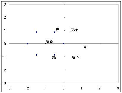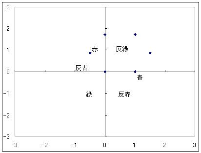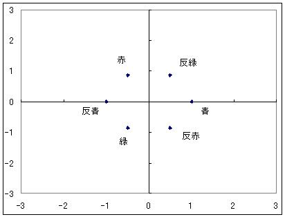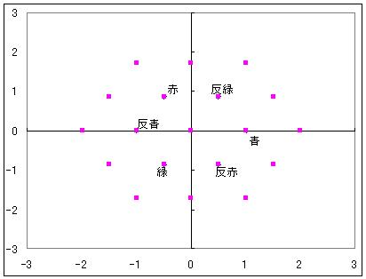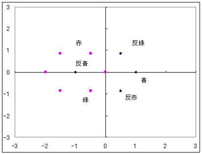 色の組み合わせに重複があったり、変化後に対応する色がなかったりした組み合わせを除去すると、これだけで8種類になってしまう。 変化後の色が青になるグルーオンの組み合わせが3つダブっているのだが、グルーオンの混合色が異なるのでこれは区別されるべきとした。 色の平面で見ると、青に作用するグルーオンの混合色の位置は下図のようになる。 もしこれが青に対する変化のように、ほかの5色に対する変化も考えると 重複を考慮しても下図のようになって19種類になってしまう。 この平面の原点が白色なのでここを抜かすと18種類だが、元々色を変えないのが変化前1色に対して3つ重複しており、これを抜かすと5種類しかないことになるため、混合色が白色のグルーオンも数えるべきだとし、それで合わせて18色ではなく19色という結論を得た。 しかしそうすると8種類といわれている話と合わない。 19という数字もなんか変だ。対称性を重視する理論で何番目かの素数が出るのは奇妙ではないか。 ということは、これは色を変化させる約束であって色そのものはないのではないか? この8種類は残り5色においてもそれだけで同様に作用する、色平面で60度ごとに回転対称なものなのではないかと考えたわけだ。 と などが等価という感じ(6色について以下同様) そうすると相変わらず8種類のままで済む。 日本語のwikipediaにはグルーオン8種類の内訳が詳しく書かれていない。 ほかのサイトやブログを見ても書いてないどころか、6種類しかないじゃないかと書いている人しか見当たらなかった。 だからこそ自分なりに調べてみたのだが、ということはwikipediaに安易に書けない理由でもあるのではないかと考えているわけで、それが「素直な色荷ではない」というものなのではないか、と今は結論付けている。 そう考えると、グルーオンが色荷を持っていないとできるかも知れず 質量0の素粒子が何ら荷を持っていないとするルールを持つ可能性が高まった。